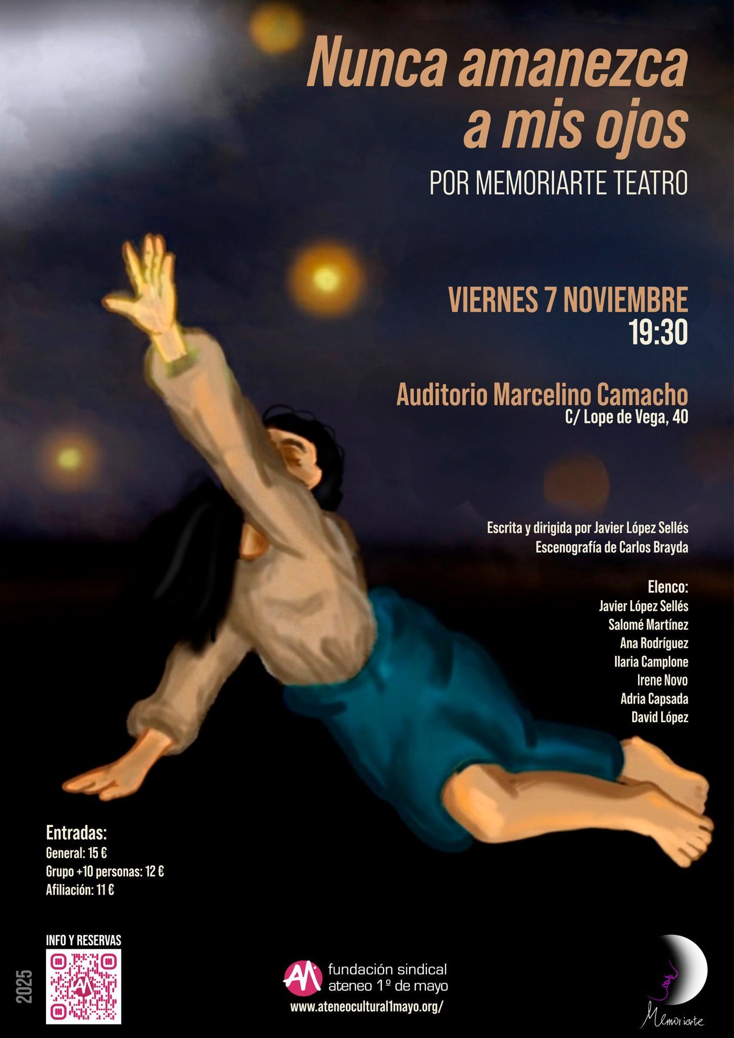 La compañía Memoriarte Teatro se enorgullece en anunciar que presentará su obra más reivindicativa y audaz, "Nunca amanezca a mis ojos", en el Teatro de Comisiones Obreras de Madrid el próximo 7 de noviembre a las 19:30 horas. Escrita y dirigida de manera ágil y amena por su autor, Javier López Sellés, la obra abre el debate sobre la escasa salud de nuestro país hacia su memoria histórica, al mismo tiempo que envía un hermoso mensaje feminista a través de Isabel, la hija del alcalde de Zalamea tras ser violada por un militar, en la obra de Calderón de la Barca.